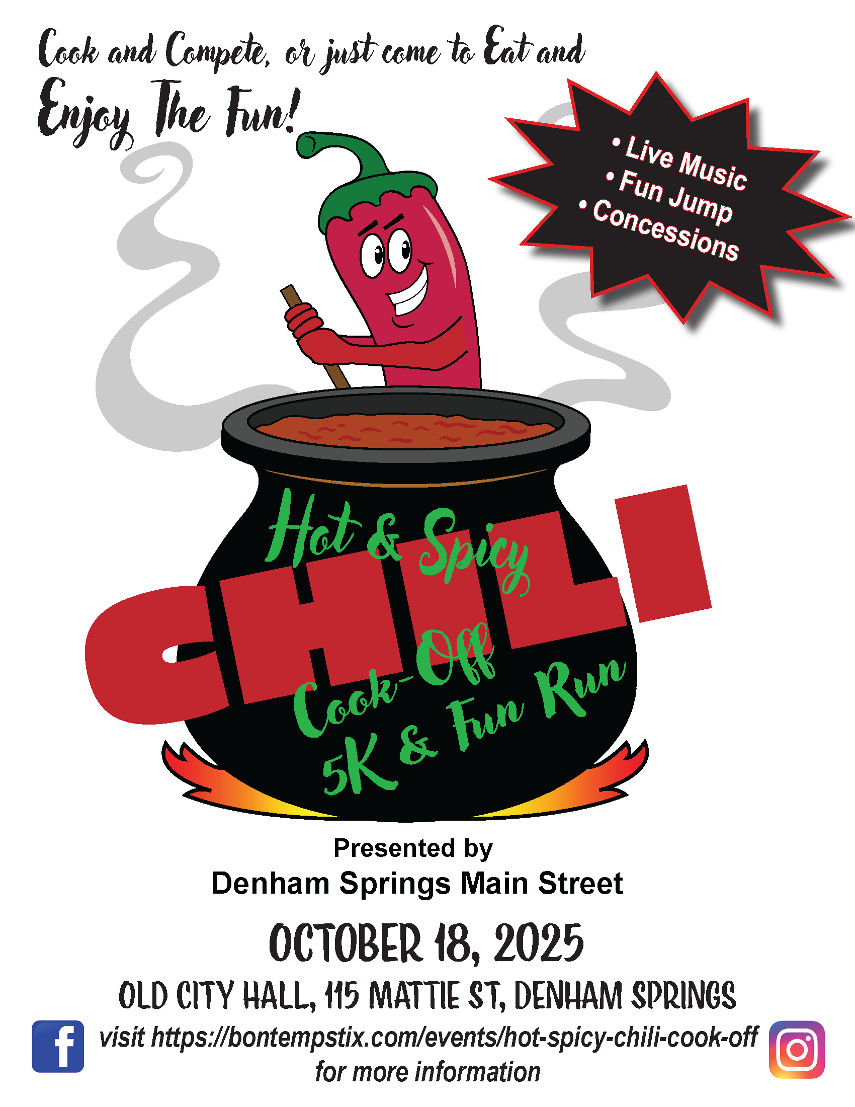If you like your Chili, mild, wild or somewhere in between, then join us this Saturday, October 18, 2025, at the Old City Hall in Downtown Denham Springs (Antique Village) for our Chili Cookoff. The tastings start at 11:00 am and with a $10 wristband, you get unlimited tastings and a vote for People's Choice. There will also be live music by Jovin Webb. So come hungry, bring your crew, and spend the day in the Antique Village with good food, live music, and local fun.