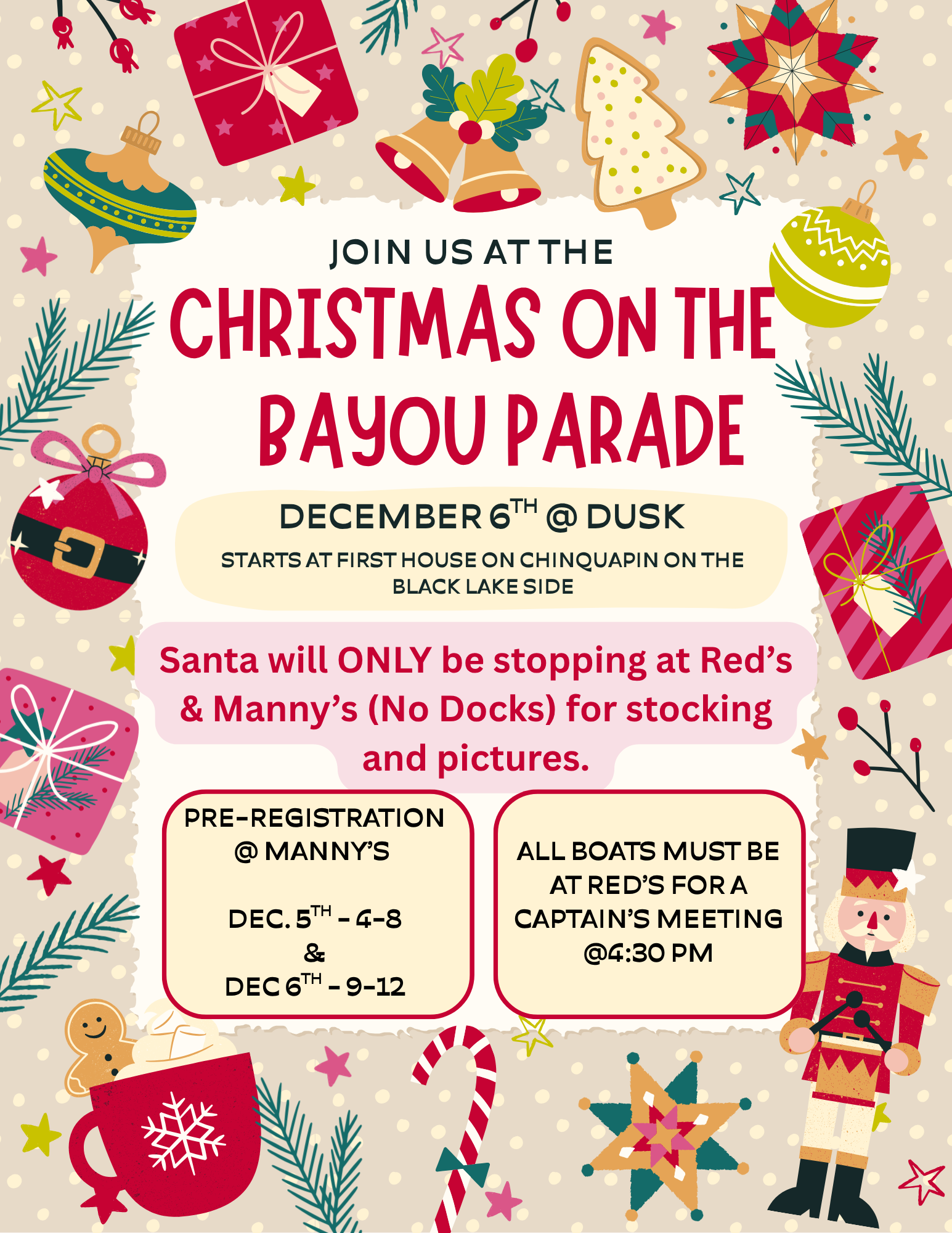 Santa Claus is coming to the Amite River at dusk with a holiday inspired Boat Parade. He will be stopping at Red's and Manny's for stockings and photos.