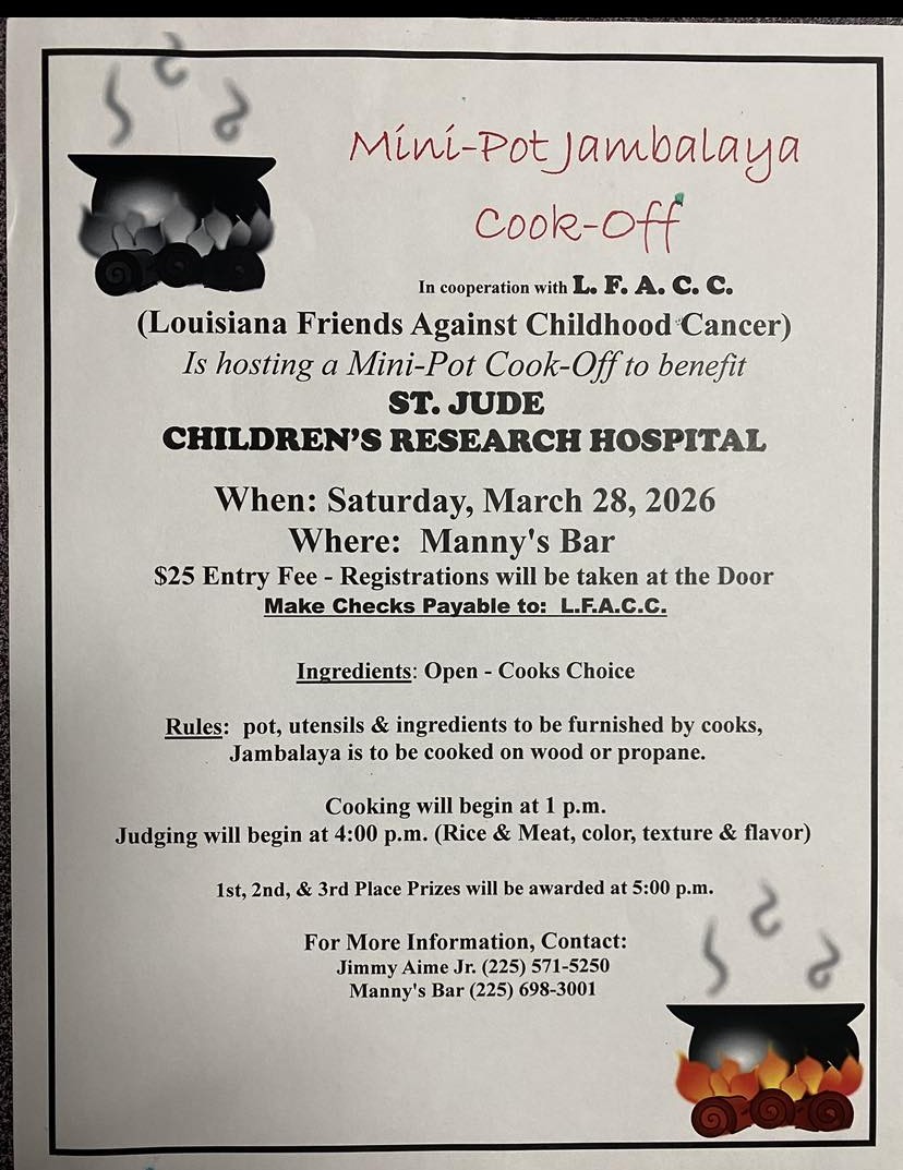 Louisiana Friends Against Childhood Cancer's Annual St. Jude Mini Pot Cook-Off scheduled for Saturday 3/28/26 at Manny’s Bar. Come out to support this great cause! Cooking starts at 1:00 pm and judging at 4:00 pm.