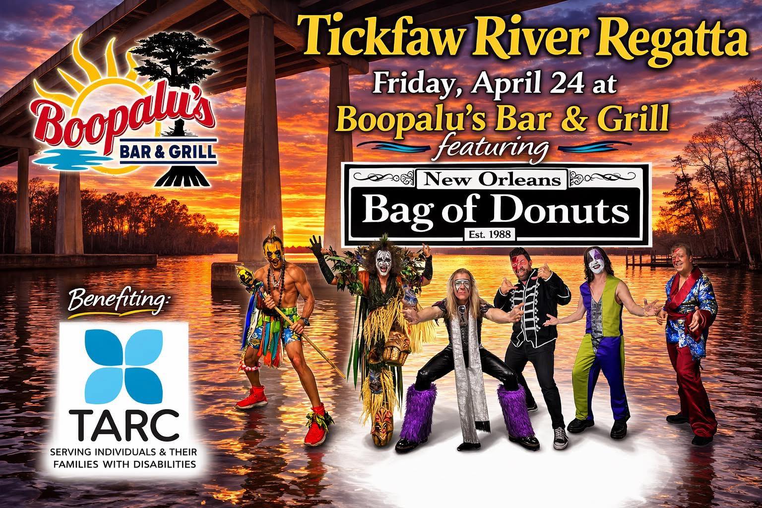 It's the annual TARC TICKFAW RIVER REGATTA! Starting with a kickoff party at Boopalus with BAG OF DONUTS on Friday, April 24! The Regatta is 3 days of fun while raising money for individuals with special needs! Tickfaw 200 is a proud sponsor of TARC!