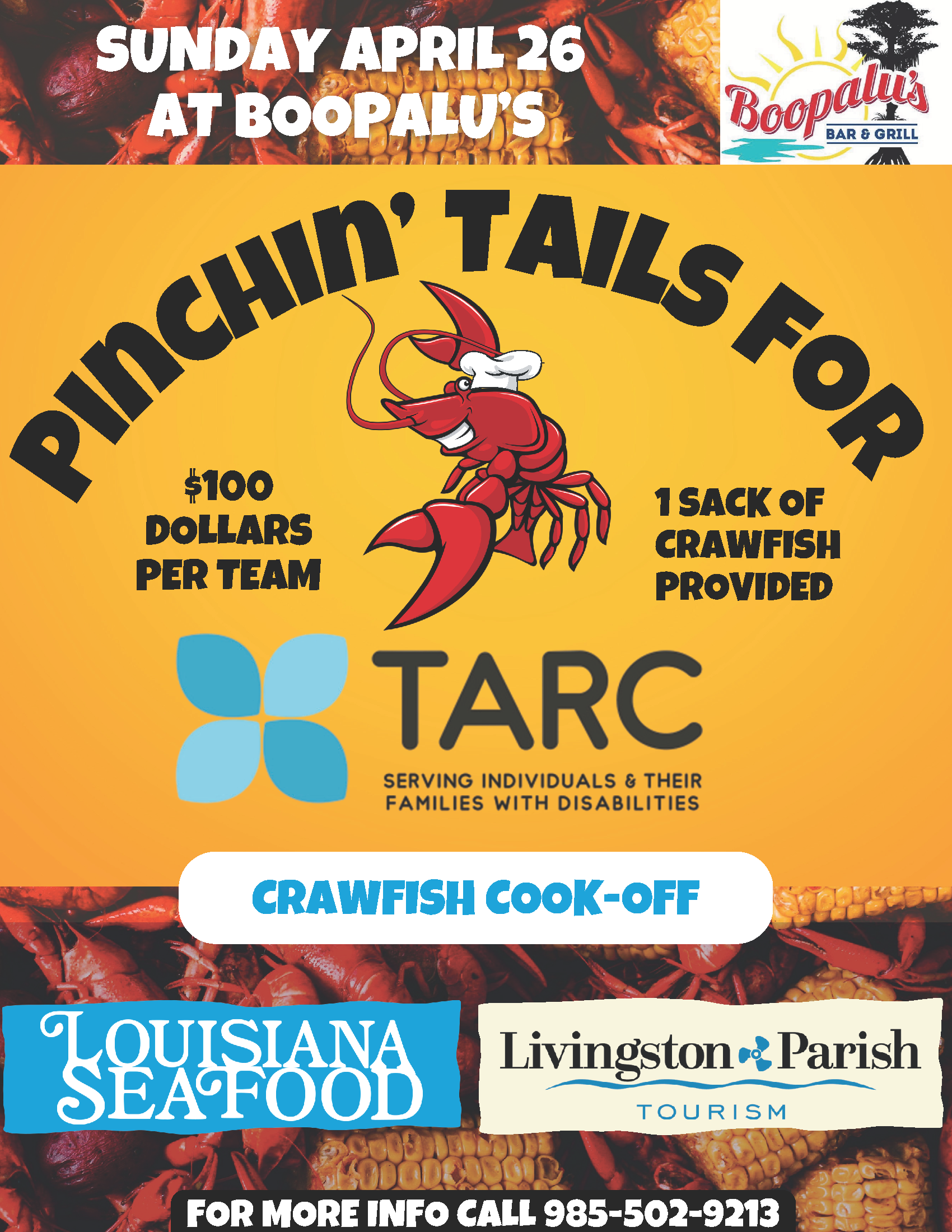 Join us for Pinching Tails for TARC at our 2026 Crawfish Cook-Off on Sunday, April 26. Cooking starts at 8:00am and Judging at Noon. The fun will be at Boopalus Grill and Bar 29669 LA-22, Springfield, LA 70462. For the general public, it is $20 for someone to attend the event. That's all you can eat crawfish. Children 10 & under are free. There will be prizes for Best Crawfish, Best Decorations and Peoples Choice.